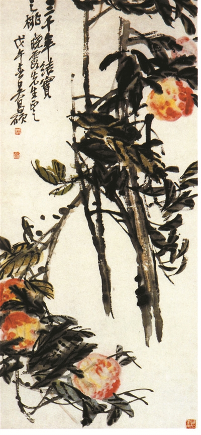 吳昌碩,原名俊,俊傾,字昌碩,別號缶廬、大龍、苦鐵等,浙江安吉人。“詩、書、畫、印”四絕的一代宗師,與任伯年、趙之謙、虛谷齊名為“清末海派四大家”。《三千年結(jié)實(shí)之桃》,作于1918年。這幅作品運(yùn)用篆書筆法,疏闊縱放,雄渾有力,顯現(xiàn)出磅礴而茁壯的氣勢,筆力強(qiáng)悍,是吳昌碩大器晚成的絕佳寫照。