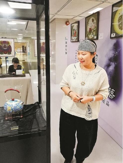 展臺前的景泰藍銀器茶壺精致漂亮,典雅高貴,它的制作者山西銀滿樓景泰藍公司技術(shù)總監(jiān)吳鳳芳在景泰藍行業(yè)已經(jīng)耕耘36年。她在上世紀90年代成功將傳統(tǒng)的銅胎掐絲景泰藍革新品種,研制成功銀胎掐絲琺瑯,并于2012年獲得的國家技術(shù)發(fā)明專利。