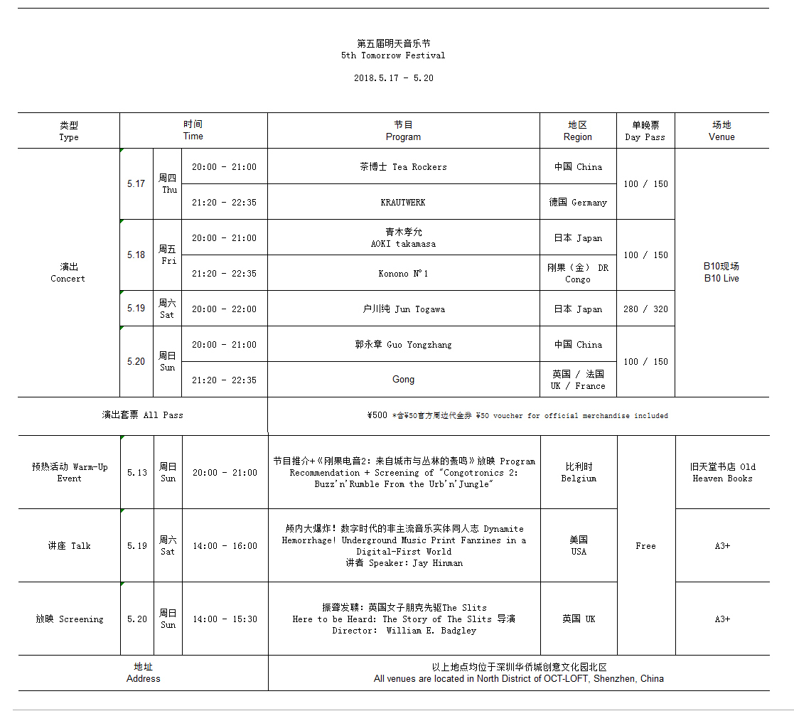 深圳新聞網(wǎng)訊 五月既至,好事即將發(fā)生。由深圳華僑城創(chuàng)意文化園主辦的第五屆明天音樂(lè)節(jié)將于2018年5月17日至20日在B10現(xiàn)場(chǎng)舉行。本屆明天音樂(lè)節(jié)作為“有形無(wú)界”華僑城創(chuàng)意文化園文博會(huì)分會(huì)場(chǎng)系列活動(dòng)的重點(diǎn)項(xiàng)目,將邀請(qǐng)來(lái)自6個(gè)國(guó)家的7組音樂(lè)家/藝術(shù)家,呈現(xiàn)包括演出、講座、紀(jì)錄片放映在內(nèi)的多元節(jié)目。除此之外,策展人將于5月13日在舊天堂書(shū)店做節(jié)前預(yù)熱,屆時(shí)會(huì)有節(jié)目介紹環(huán)節(jié)和一場(chǎng)完整的放映活動(dòng)。