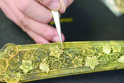 經(jīng)過(guò)3年多的運(yùn)營(yíng)打造,傳承基地已成為花絲鑲嵌非遺文化傳承的重要力量,并成立了花絲鑲嵌傳承人集聚中心、花絲鑲嵌產(chǎn)品研發(fā)中心、花絲鑲嵌產(chǎn)品制作展銷中心。