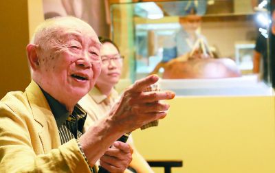此次展覽作品以紫砂壺體為載體,借助紫砂鐫刻工藝半繪半刻,是黃永玉在創(chuàng)作媒材上又一次新的嘗試。作為書畫界有名的“90后”老頑童,在展覽開幕式上,黃永玉雖然耳朵有點(diǎn)背,但依然“金句”頻出,話里透著天真幽默:“一個(gè)老頭閑在家里沒事兒干,畫了一些壺。用時(shí)髦的話來講,就是行為藝術(shù)吧!”