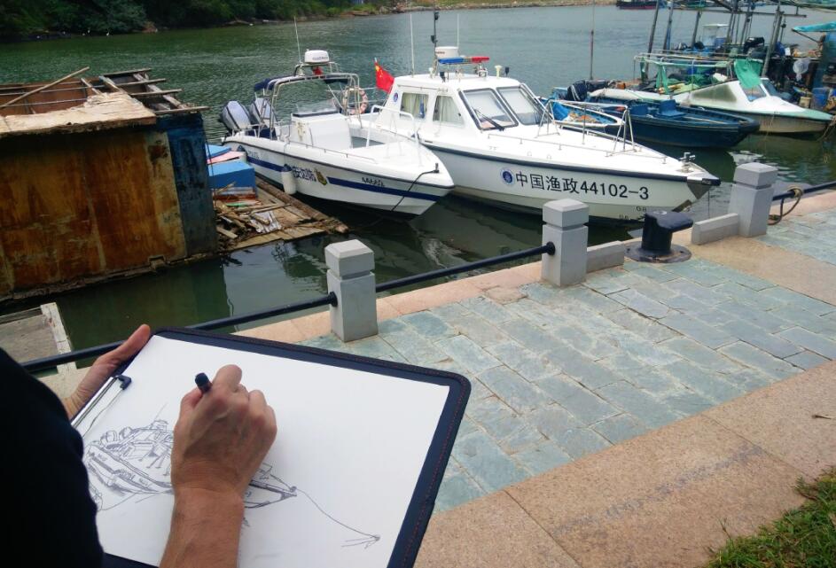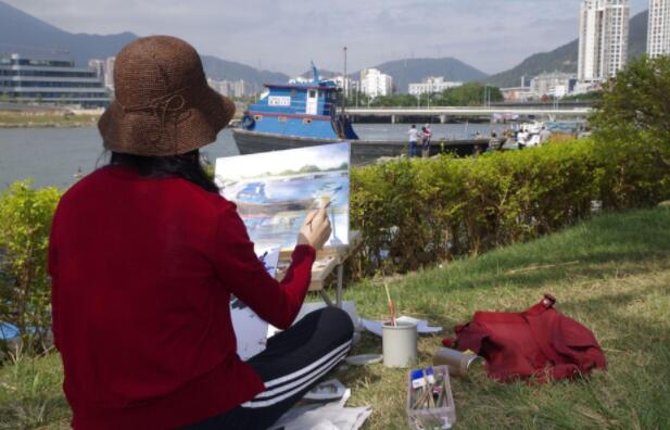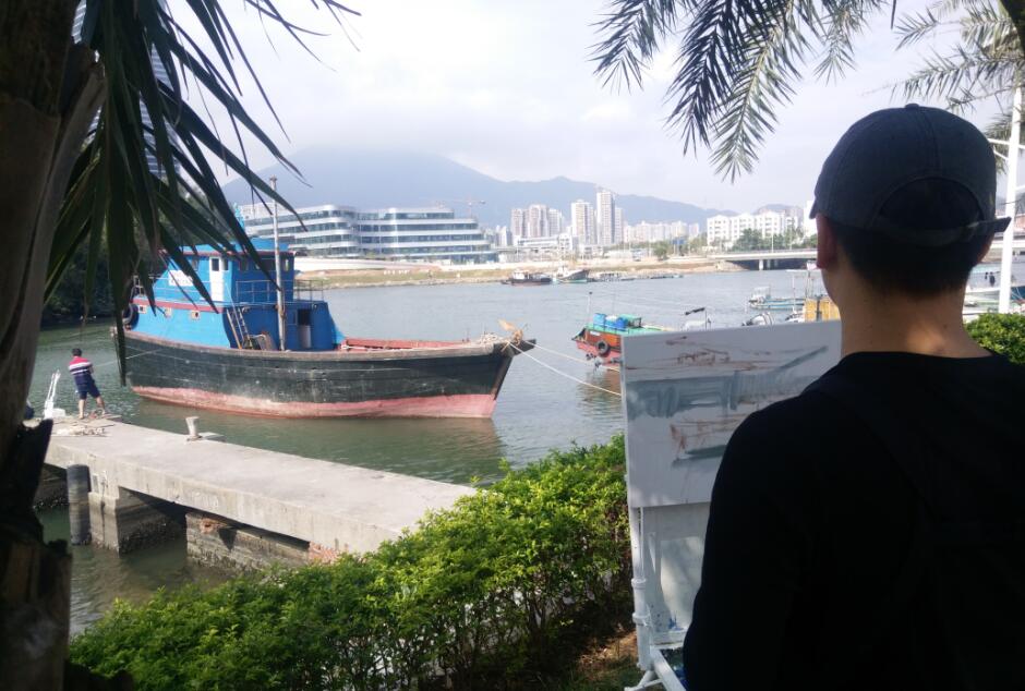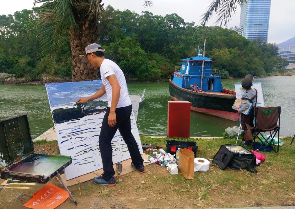 優(yōu)美的景色映入畫家們眼簾,點(diǎn)燃了他們的創(chuàng)作激情。來(lái)到鹽田之后,藝術(shù)家們紛紛找好寫生地點(diǎn),擺好畫架,迅速進(jìn)入創(chuàng)作的狀態(tài)。他們當(dāng)中一部分來(lái)到了鹽田漁港,鹽田海鮮街后的小漁村避風(fēng)港。蔚藍(lán)的大海、旁邊的綠樹(shù)、避風(fēng)塘內(nèi)停泊的船只、白色的海鳥(niǎo)、釣魚(yú)的人以及遠(yuǎn)方火熱的建設(shè)場(chǎng)景都呈現(xiàn)在畫家的筆端;另一部分藝術(shù)家來(lái)到了位于三洲田深圳會(huì)計(jì)進(jìn)修學(xué)院的梧桐溪谷,小橋流水人家、奇石山林則一一被傾注于畫紙。
