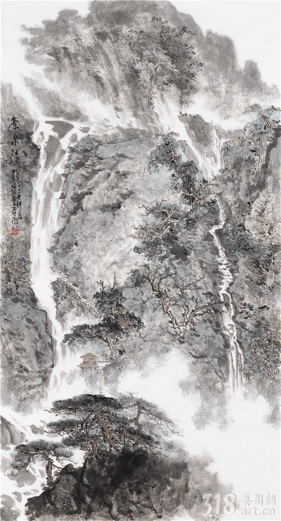 山水之所以成為中國繪畫的永恒主題,跨越時空,也在于“自然”這一永恒主題是人類心中的凈土。與卡拉揚所說的以巴赫音樂“校正視聽”同出一轍,山水藝術家籍借山水畫,作為修煉自我的一條途徑。與音樂一樣,山水畫既有抽理的邏輯,又有造化的邏輯。師造化能有溫度,抽理能讓我們的心靈得到升華與純凈,我們的手、眼、心在師造化和抽理中,最后達到師物游心、物我兩忘之境。范陽先生終年隱居江西武功山和楊岐山,師造化使他筆下的丘壑、林泉、松石,高曠而有真意,不落程式窠臼。早年潛心古法研究,謙遜問學,轉益多師。門庭既闊,筆墨則不得不精,眼界既寬,格調則不得不高。近年的作品,更從早年的細膩綿密,化而為奔放渾厚。其畫不論大作或小品,首取氣韻,不營營于一草一木,放逸中卻又能見綿密細致。又以草情筆法入畫,于平直處流露其錚錚骨骼及磊磊性情,飛動處可見其心瀾翻動,觀其作,可想見其作畫時心手雙暢之態(tài),如汩汩之泉,一瀉千里而不得止,非長年積養(yǎng)之功不可得哉。