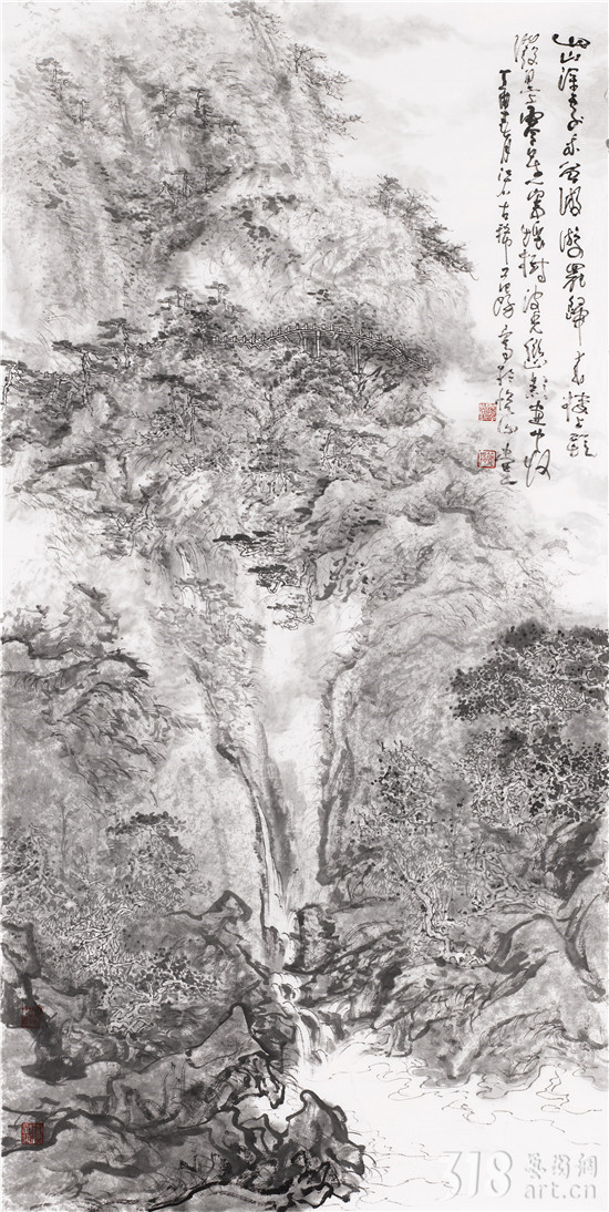 我以為,范陽先生是真正在心性上貼近古人“不下堂筵,坐窮泉壑”,其現(xiàn)居贛中名岳武功山、楊岐山之中。尤其武功山,史上與衡山、廬山并稱江南三大名山,被冠以“衡首廬尾武功中”,山脈綿延浩瀚,茫茫無際。范陽先生終日面山臨壑,弄筆自適,得武功真容。山水畫從來就不是簡單的描摹自然的風光,無論丘園養(yǎng)素還是泉石嘯傲,都是畫者精神的自然流露,這是畫家筆墨情態(tài)的表達,亦是畫家藝術境界追求的體現(xiàn)。對于山林的描繪,承載了畫者對泉石意趣的向往,對于林下境界的追求。范陽先生的山水畫作品長于布景,對山中的“陰、晴、朝、夕”的細膩描繪都有他自已獨特感悟和表達。筆下極丘壑浩渺之勢,奇峰羅列,宛有風骨,深壑幽谷,其勢超峻;至于松柏掩映,峭壁涌泉,野道幽麓,于野逸之態(tài)甚備。范陽先生數(shù)十年來遍臨南北宗諸家,遠溯元人四家,清初四王,近至黃秋園,上下求索,崇穆有加,最終歸皈真逸正脈。新近年逾七十之作,日漸精熟,蒼腴古厚,更趨融古化古之態(tài),細究其筆下蹤跡:子久?麓臺?秋園?各不相肖,而莫不精備。諦觀其中景象:匡廬?武功?羅霄?渾然而化,不一而足。如此境地當稱“妙解”。