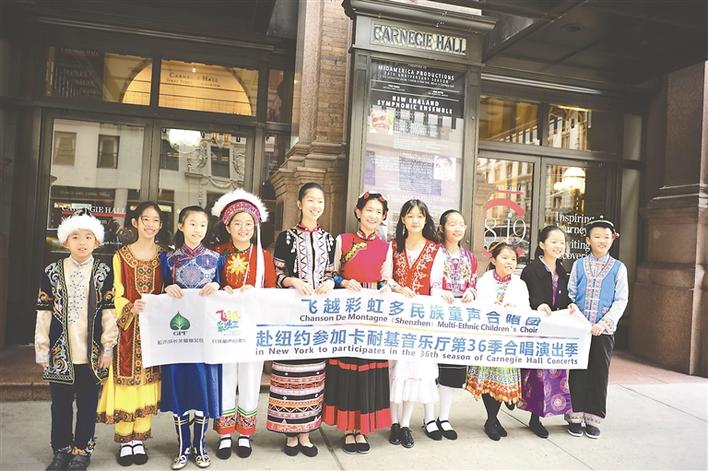 深圳飛越彩虹合唱團(tuán)11個(gè)小演員身著色彩紛呈的少數(shù)民族服裝放歌卡耐基音樂廳