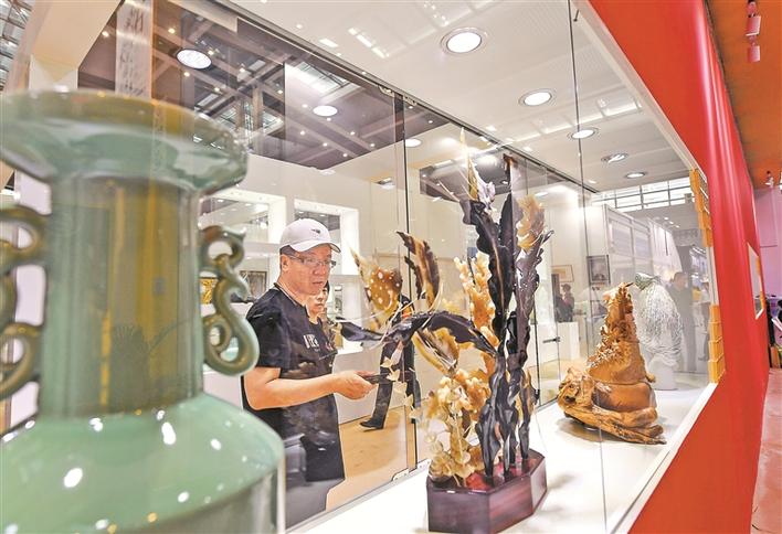 在9號館的5592平方米的場地上,精致的生活器具、體量龐大的玉雕、惟妙惟肖的根雕以及各式各樣的藝術精品都在講述著背后的匠人故事。
