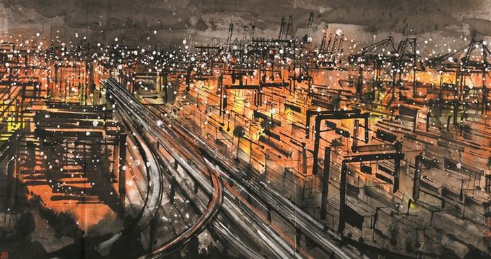 楊曉洋創(chuàng)作的《東方巨港——璀璨鹽田》是此次入選的國畫作品之一。作品以深圳港夜色為主題,體現(xiàn)了中國改革開放前沿城市深圳滄海桑田的巨變和這座城市的繁榮景象。同樣是表現(xiàn)現(xiàn)代題材的城市景觀,從楊曉洋的作品中就可看出以對版畫的黑白對比手法、平面構(gòu)成的象征形式、夜景特色的表現(xiàn)手法的出色運(yùn)用等方式來表達(dá)出作者對都市景觀的趣味。