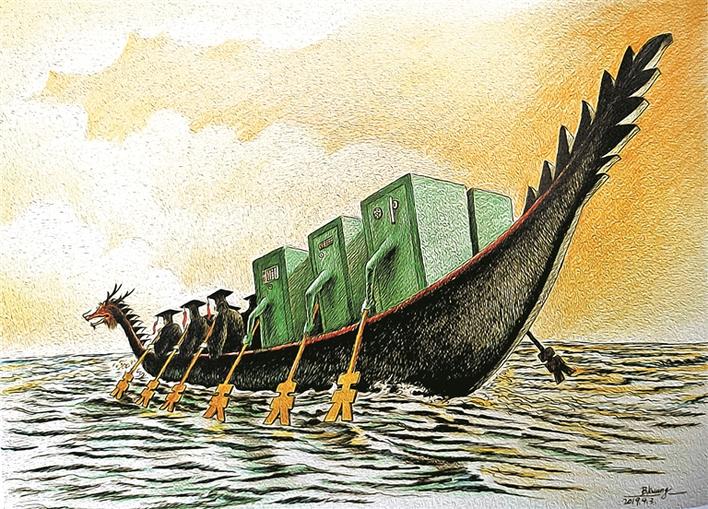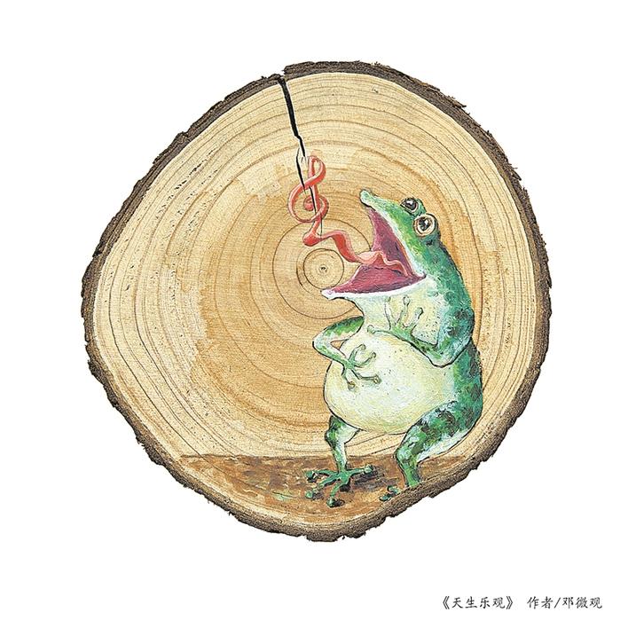 上榜漫畫(huà)家鄧微觀系深圳市寶安區(qū)打鐵文藝社社長(zhǎng),其《感物系列》以見(jiàn)物興感為主線,展開(kāi)豐富的想象力,用動(dòng)物擬人的方式幽默詼諧地抒發(fā)人生感悟,讓人會(huì)心一笑之余引起共鳴,令觀眾感嘆藝術(shù)家的漫無(wú)邊際的“腦洞”。對(duì)于作品首次入選國(guó)內(nèi)美術(shù)界規(guī)格最高的國(guó)展,鄧微觀很興奮:“這是對(duì)我這個(gè)系列作品的高度肯定?!薄陡形锵盗小废盗凶髌吩从谒e逛發(fā)呆時(shí)的想象碎片,將這個(gè)碎片貫穿就成了這個(gè)系列作品。鄧微觀在茶余飯后經(jīng)常到鐵崗的西鄉(xiāng)河邊散步,河中不時(shí)傳來(lái)低頻厚實(shí)的“男低音”引起他的注意,此起彼伏,聽(tīng)來(lái)如交響曲一般通達(dá)舒暢。他循聲尋覓,原來(lái)是蛤蟆的聲音,只見(jiàn)這些“音樂(lè)家”在下水道洞口,在草叢中,河道縫中快樂(lè)地歡唱……這些天生的樂(lè)觀者給鄧微觀帶來(lái)美妙的心情,所以創(chuàng)作了這幅《天生樂(lè)觀》。再如《三餐之余》,有時(shí)飯后經(jīng)常會(huì)在茶幾前發(fā)發(fā)呆,思考人生不應(yīng)該只是面包和蘋(píng)果,還應(yīng)有點(diǎn)別的……