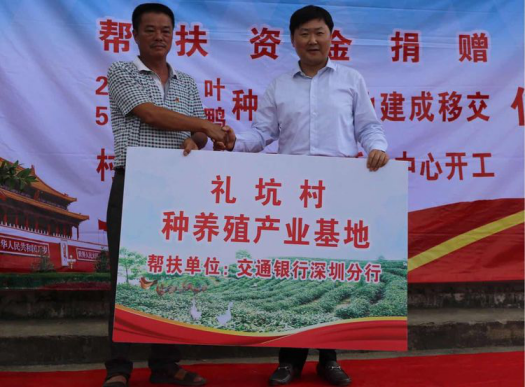 當日,交通銀行深圳分行籌劃建設的茶山、種養(yǎng)殖基地、新一批雞苗和2017年度專項扶貧資金正式移交和撥付給禮坑村,并舉行了村民文化廣場開工奠基典禮。陳隃表示,交行深圳分行把幫扶禮坑村做為落實黨的政策的重點工作,做為國有銀行承擔政治責任、社會責任的重要出發(fā)點,做為加強黨的建設的重要抓手,下一步圍繞三個轉變繼續(xù)深化扶貧工作,一是工作目標轉向社會主義新農(nóng)村建設,努力將禮坑村建設成新農(nóng)村建設示范村中的示范點;二是工作方法從貧困戶脫貧向產(chǎn)業(yè)脫貧轉變,繼續(xù)發(fā)掘新項目,形成更加持續(xù)化的產(chǎn)值和收益;三是在制度建設上下功夫,強化社會主義新農(nóng)村建設的制度先行和制度示范。