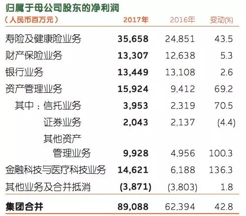 除了個人業(yè)務的大放異彩,平安集團的核心金融業(yè)務也是年報的一大亮點。2017年,中國平安的壽險及健康險新業(yè)務價值大增32.6%,內(nèi)含價值營運回報率35.5%;產(chǎn)險市場份額提升1.3個百分點;銀行零售業(yè)務凈利潤占比提升至67.6%。