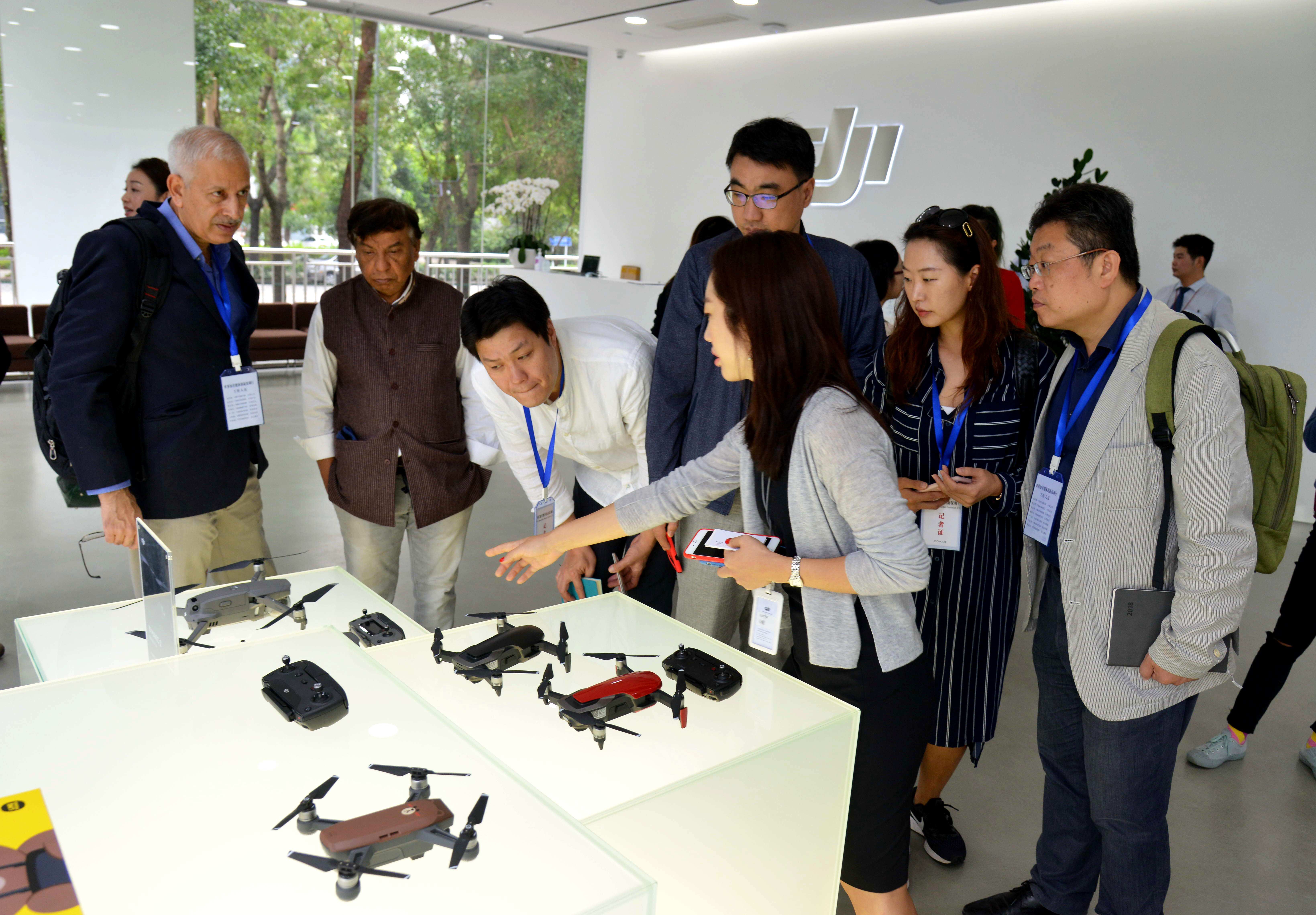 各國記者們在大疆創(chuàng)新科技有限公司參觀無人機產(chǎn)品。