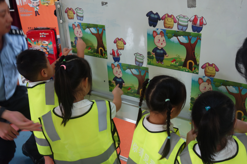 熊警官從交通工具講起,分別講述了乘坐不同交通工具所帶來的風(fēng)險及注意事項,并通過幽默風(fēng)趣的“兒童安全座椅”小視頻,提醒在座的小朋友及家長要注意細(xì)節(jié),具有防范風(fēng)險的意識。在互動游戲環(huán)節(jié),熊警官通過與小朋友們的互動,講解了紅綠燈的來源、日常的交通標(biāo)識以及過馬路的規(guī)則。現(xiàn)場的同學(xué)們也非常踴躍,在“被看見才安全”環(huán)節(jié)時,許多小朋友主動上臺,給小兔子穿上最亮最顯眼的衣服,使其成為最靚的仔。