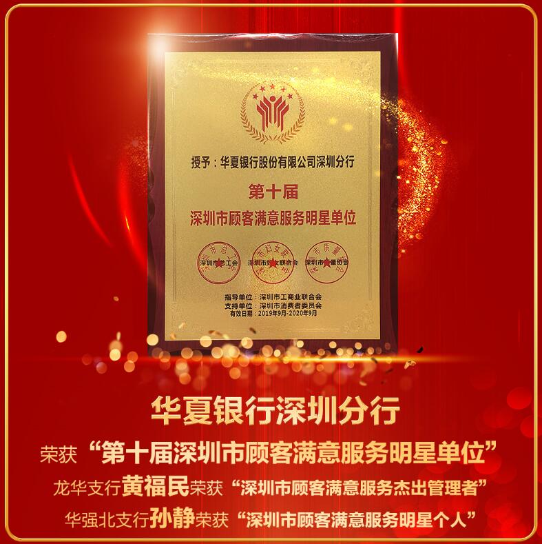 深圳新聞網(wǎng)訊 近日,華夏銀行深圳分行在“第十屆深圳市顧客滿意服務(wù)明星”暨“第二屆深圳市優(yōu)質(zhì)服務(wù)示范單位”評(píng)選活動(dòng)中,榮登“深圳市顧客滿意服務(wù)明星單位”榜首,“華夏服務(wù)”品牌影響力再次得到行業(yè)和客戶的高度認(rèn)可。同時(shí),該行龍華支行行長黃福民、華強(qiáng)北支行副行長孫靜分別獲得“深圳市顧客滿意服務(wù)杰出管理者”和“深圳市顧客滿意服務(wù)明星”榮譽(yù)稱號(hào)。