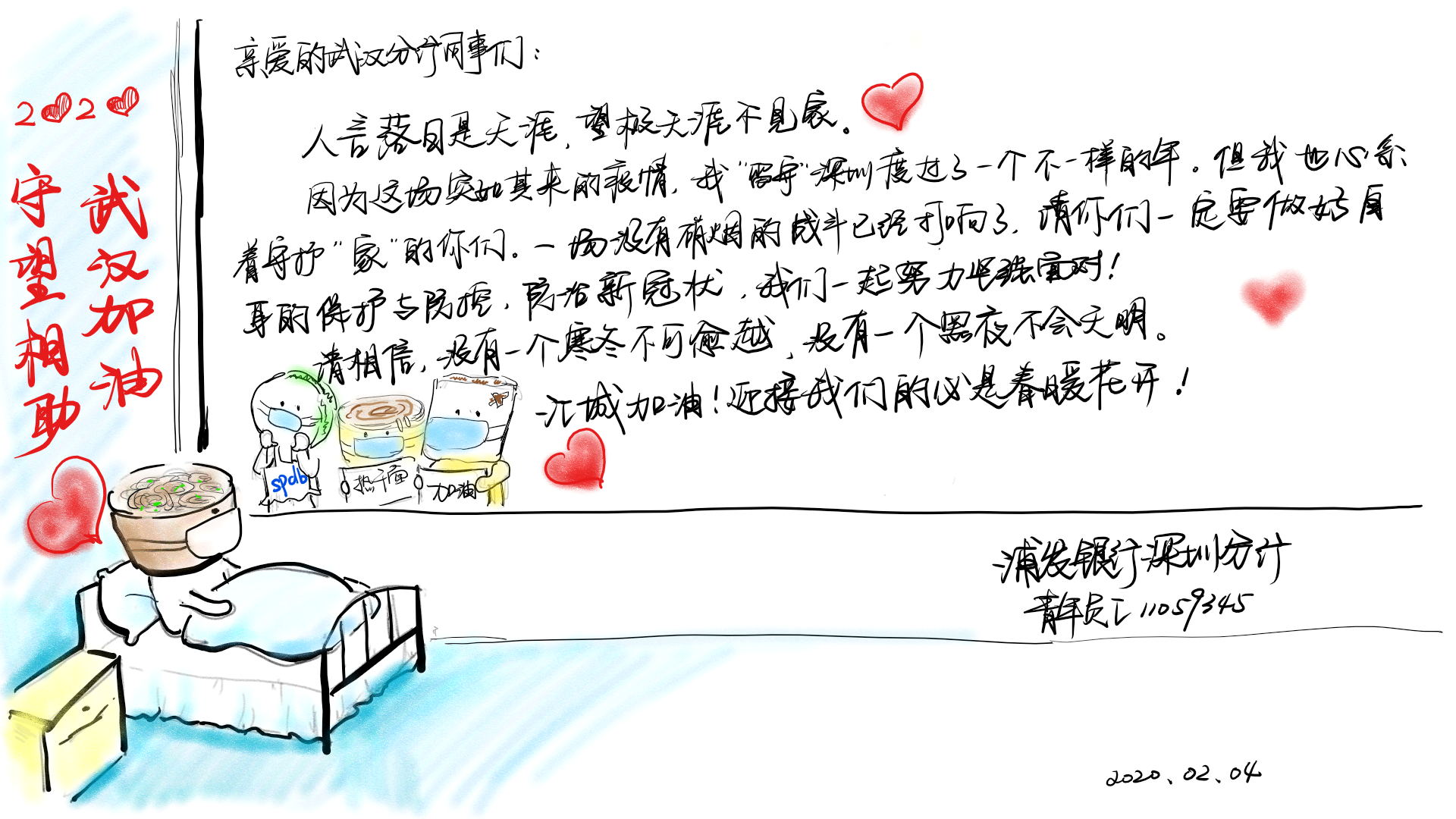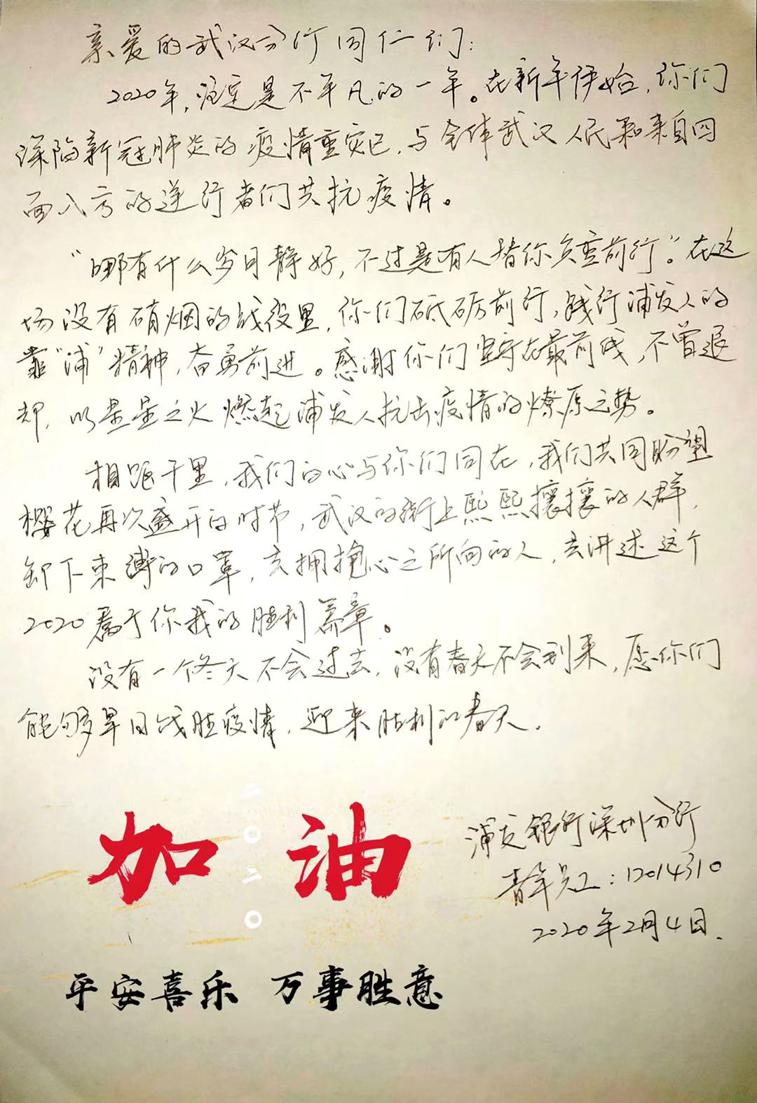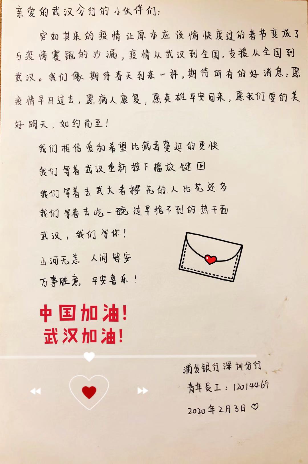 2月3日,浦發(fā)銀行深圳分行團(tuán)委向全體青年員工發(fā)出了一封倡議書。在倡議書中,該行團(tuán)委號召廣大團(tuán)干部、團(tuán)員青年立即行動,充分發(fā)揮黨的助手和后備軍作用,展現(xiàn)青年突擊隊作為,為堅決打贏疫情防控阻擊戰(zhàn)貢獻(xiàn)力量,并向青年提出三個要求:“堅定信心不迷茫,聽黨指揮勇?lián)?dāng)”、“科學(xué)防范不信謠,眾志成城控疫情”、“居家辦公不離崗,服從指揮勇?lián)?dāng)”。當(dāng)日,浦發(fā)銀行深圳分行發(fā)起了給武漢分行同事寄送家書的活動,該行全體青年手寫家書,圖文并茂、紙短情長,表達(dá)了對疫區(qū)“戰(zhàn)友們”最深切的關(guān)愛和鼓勵,身體力行做好他們堅強(qiáng)的后盾。