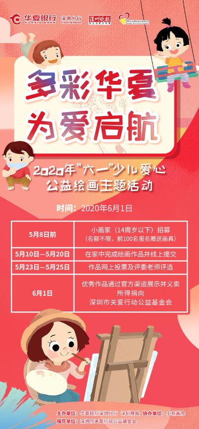 據(jù)了解,該活動(dòng)是由華夏銀行深圳分行攜手深圳晚報(bào)、小燕畫院開(kāi)展的“多彩華夏為愛(ài)啟航”少兒愛(ài)心公益繪畫。活動(dòng)向深圳市民招募小畫家,邀請(qǐng)他們用手中畫筆描繪精彩世界。同時(shí),將繪畫賦予公益與愛(ài)心,評(píng)選出部分優(yōu)秀作品進(jìn)行線上義賣,以點(diǎn)亮地貧兒童的生命之光。