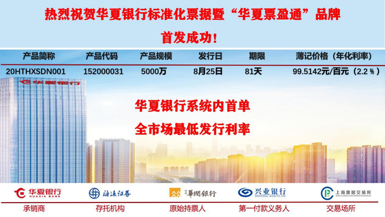 深圳新聞網(wǎng)·見圳客戶端2020年8月25日訊 今日,在深圳特區(qū)成立40周年來臨之際,記者從華夏銀行深圳分行獲悉,由該行承銷的海通證券華夏票盈通2020年度第一期標準化票據(jù)產品(產品簡稱:20HTHXSDN001)在該行系統(tǒng)內率先成功發(fā)行。本期標準化票據(jù)發(fā)行規(guī)模5000萬,簿記價格99.5142元/百元面值(相當于年化利率2.2%),發(fā)行利率創(chuàng)全市場可比同類型、同期限產品新低,將以更低的融資成本支持“穩(wěn)企業(yè)保就業(yè)”工作。