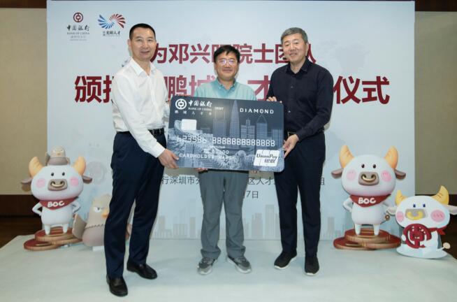 深圳新聞網·見圳客戶端2020年11月8日訊 昨日,深圳市光明區(qū)委常委、組織部部長繩萬青,中國銀行深圳市分行副行長韓竹代表深圳市光明區(qū)人才辦和中國銀行深圳市分行,為生物學家、美國國家科學院院士鄧興旺及部分團隊成員頒發(fā)了“中銀鵬城人才卡”鉆石卡,這是全市范圍內首張向在深院士發(fā)放的“中銀鵬城人才卡”,標志著這張由光明區(qū)人才辦和深圳中行共同策劃推出的人才卡實現了市級認定的各層級人才全覆蓋。鄧興旺院士是深圳市杰出人才獲得者、深圳市作物分子設計育種研究院院長、深圳興旺生物種業(yè)有限公司董事長,他帶領團隊2010年到深圳創(chuàng)業(yè),多年來在水稻領域取得兩項重大技術突破,其中“潔田模式”大規(guī)模市場示范面積達到50萬畝,有效加快了中國農業(yè)的輕簡化、現代化步伐。