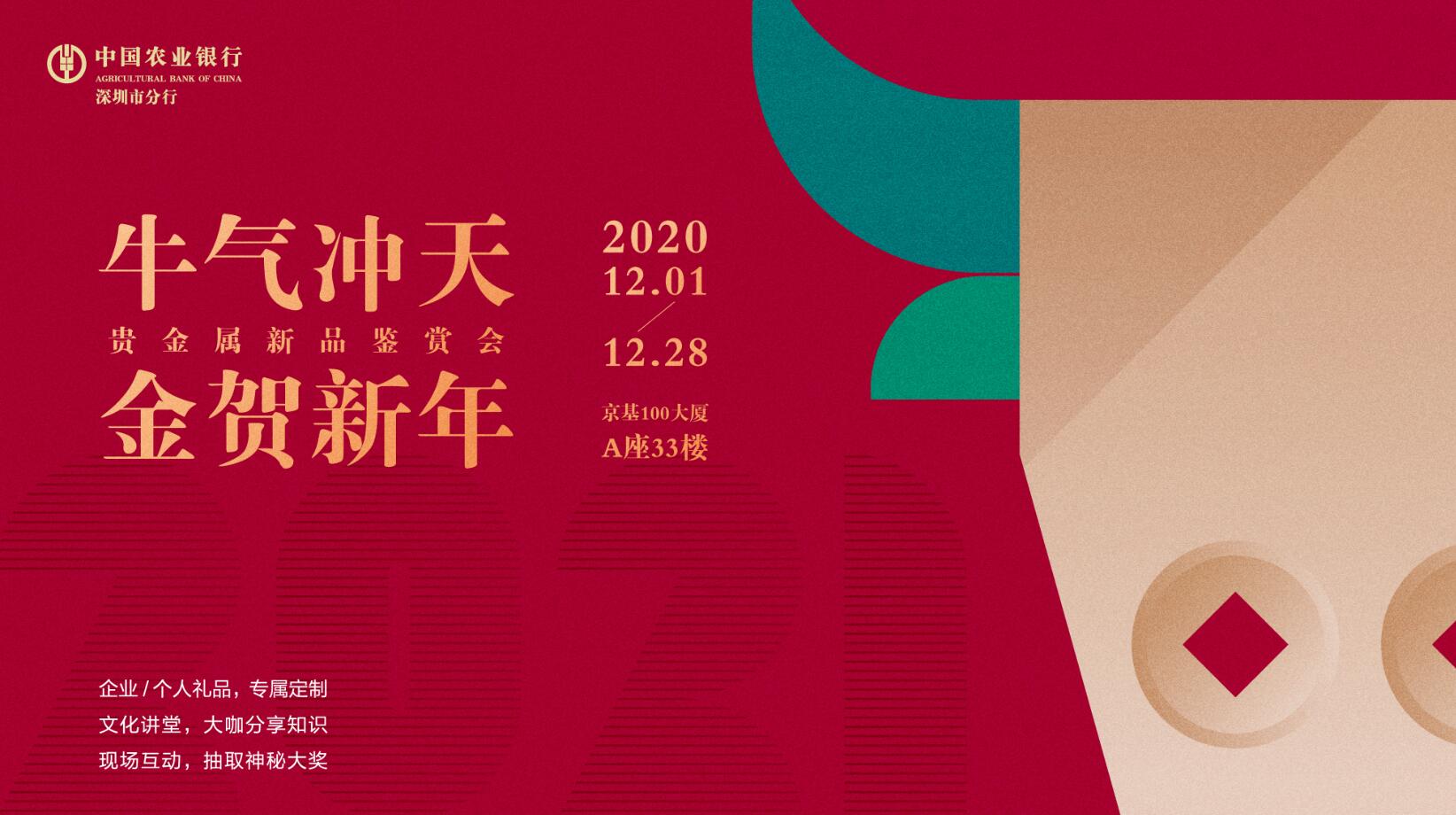 深圳新聞網(wǎng)·見圳客戶端2020年12月1日訊 為滿足客戶的多元化贈禮、收藏、投資需求,為客戶提供個性化定制服務(wù),2020年12月1日至28日,深圳農(nóng)行在京基100大廈A座33樓舉辦“牛氣沖天·金賀新年”貴金屬新品鑒賞會。