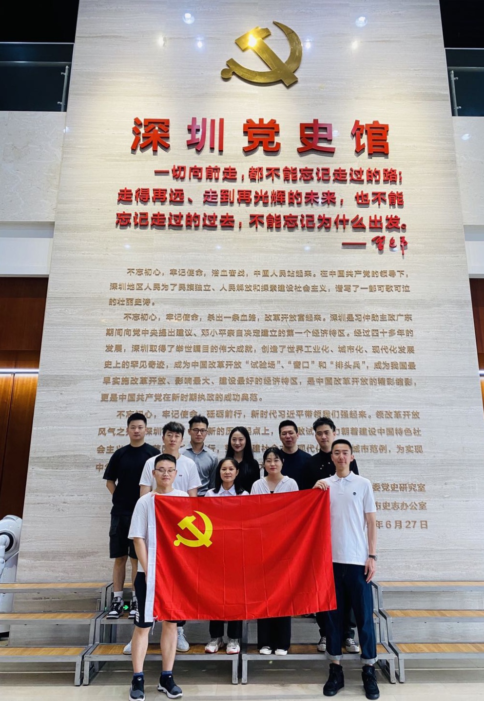 離開陵園,浦發(fā)銀行深圳分行的黨員們在深圳黨史館向青年員工介紹了深圳地區(qū)在中國共產(chǎn)黨領(lǐng)導(dǎo)下進(jìn)行革命、建設(shè)和改革的不懈奮斗史以及取得的輝煌成就。大家一起在黨史館門口誦讀,“一切向前走,都不能忘記走過的路;走得再遠(yuǎn)、走到再光輝的未來,也不能忘記走過的過去,不能忘記為什么出發(fā)”。