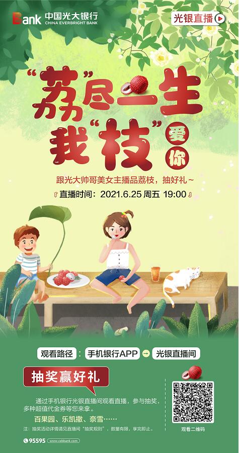 深圳新聞網(wǎng)2021年6月25日訊(記者 朱琳)“日啖荔枝三百顆,不辭長作嶺南人”“一騎紅塵妃子笑,無人知是荔枝來”……時逢盛夏,又是品嘗荔枝的最佳時節(jié)。6月25日19時,光大銀行深圳分行將通過手機銀行APP“光銀直播”共同開啟荔枝品嘗之“夜”,并送出精美大獎,愛吃荔枝的你一定不要錯過。