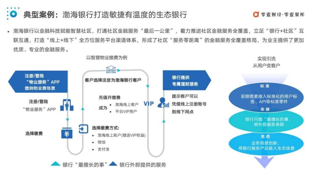 以此次該行入圍行業(yè)權(quán)威報告的“智慧物業(yè)”金融科技創(chuàng)新服務(wù)項目為例,渤海銀行創(chuàng)新業(yè)務(wù)場景——繳納物業(yè)費場景,社區(qū)居民通過“物業(yè)服務(wù)APP”繳納物業(yè)費時,可以選擇渤海銀行線上賬戶為付費方式,當用戶充值并繳費后,便同時成為了渤海銀行線上客戶和平臺V IP,并享受銀行提供的專屬理財服務(wù)。通過將自身服務(wù)產(chǎn)品嵌入“物業(yè)服務(wù)”A PP,只做“最擅長的事,渤海銀行將外部服務(wù)串聯(lián)”,最終實現(xiàn)A PP用戶到自身客戶的轉(zhuǎn)變。