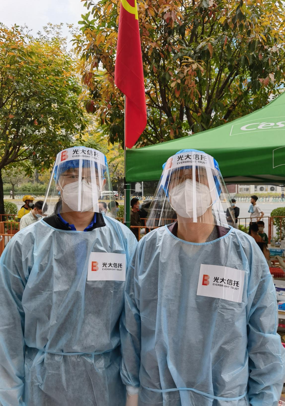 光大信托深圳區(qū)域黨支部在接到協(xié)同抗疫通知后,第一時(shí)間組織黨員和員工積極報(bào)名參與志愿服務(wù)。3月5日,恰逢毛澤東主席“向雷鋒同志學(xué)習(xí)”題詞的紀(jì)念日,光大信托公司風(fēng)險(xiǎn)總監(jiān)姚恒民同志以年近6旬的高齡,率先垂范的沖在一線,帶領(lǐng)深圳區(qū)域黨員同志們,投入福田區(qū)蓮花街道獅嶺社區(qū)的核酸檢測志愿服務(wù)工作,用實(shí)際行動和赤誠情懷書寫共產(chǎn)黨員的責(zé)任和擔(dān)當(dāng)。當(dāng)天天氣炎熱,太陽暴曬下穿著防護(hù)服兩個小時(shí)工作下來,全身已完全濕透,但他們以飽滿的激情、負(fù)責(zé)任的態(tài)度詮釋了一個共產(chǎn)黨員在黨旗下宣誓的誓言。光大信托的一位黨員同志說:“疫情就是命令,防控就是責(zé)任,崗位就是戰(zhàn)場,每個服務(wù)點(diǎn)的黨旗就是一種信仰,每個黨員就是一面旗幟,每個黨支部就是一個堡壘,哪里有需要,哪里就有光大人的身影。”