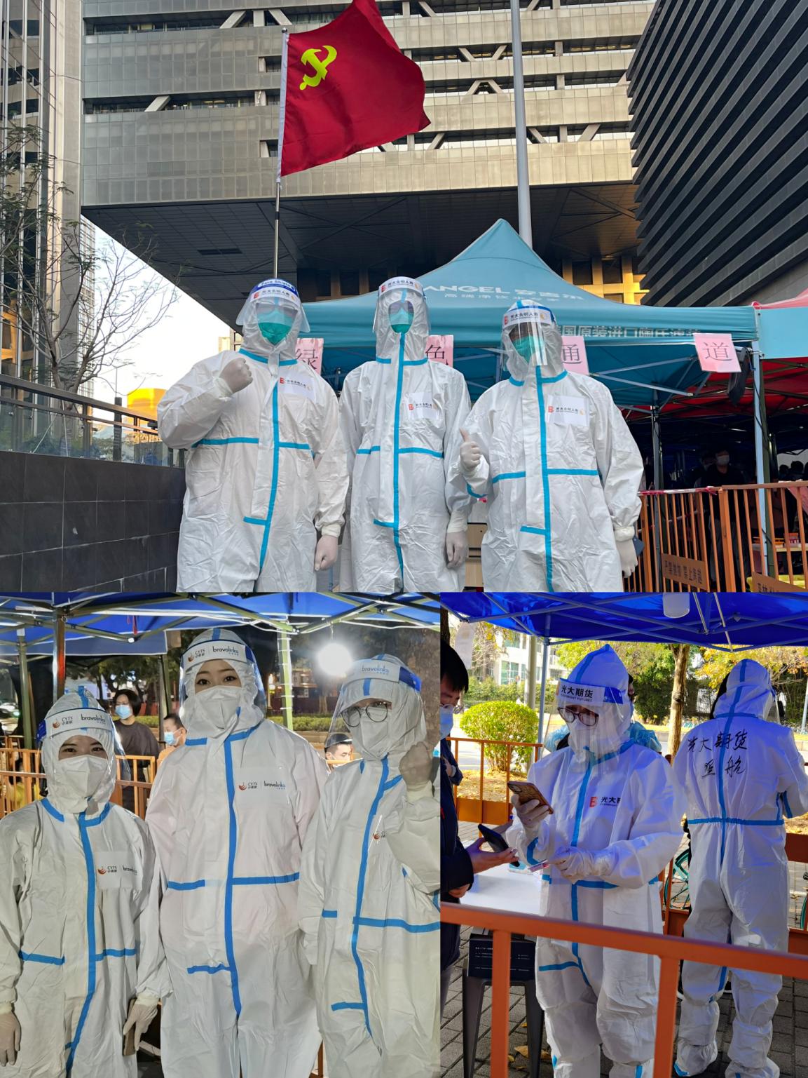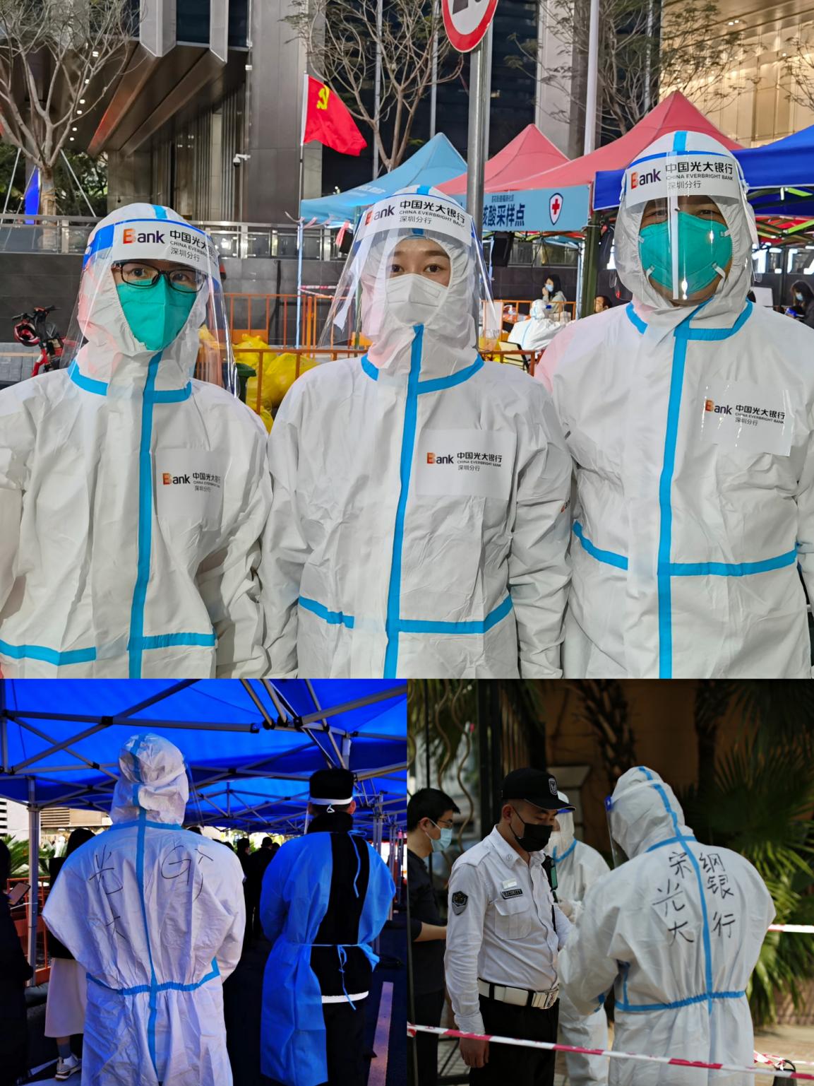 在疫情防控的關(guān)鍵時(shí)期,深圳分行黨委堅(jiān)決貫徹落實(shí)當(dāng)?shù)卣姆揽匾?,分行黨委書記、行長韓學(xué)智同志緊急召開黨委會議,啟動應(yīng)急預(yù)案,積極部署并投入疫情防控工作,確保日常營運(yùn)和客戶服務(wù)等工作有序運(yùn)轉(zhuǎn)。在深圳福田區(qū)金融工作局的組織與號召下,分行黨委要求全體黨員干部發(fā)揮先鋒模范作用,主動為社區(qū)疫情防控工作提供志愿服務(wù)。分行黨委委員們率先垂范,分頭帶領(lǐng)黨員干部奔赴社區(qū)慰問抗戰(zhàn)一線工作人員,并犧牲周末休息時(shí)間深入社區(qū)核酸采樣點(diǎn),脫下西裝變身“大白”。深圳分行各黨支部和團(tuán)支部先后組織開展各類志愿服務(wù)累計(jì)時(shí)長超過100小時(shí),活躍在防疫抗疫一線的同志們在全力保障廣大群眾金融服務(wù)需求的同時(shí),和醫(yī)護(hù)工作者一同守護(hù)著千家萬戶。作為集團(tuán)駐深企業(yè)協(xié)同工作的牽頭單位,分行牽頭組建駐深企業(yè)志愿者先鋒隊(duì),緊急投身福田區(qū)抗擊疫情的各個戰(zhàn)線和各個角落,不分晝夜、不論疲倦、以實(shí)際行動踐行初心、使命和擔(dān)當(dāng),弘揚(yáng)新時(shí)代共產(chǎn)黨人的奉獻(xiàn)精神?!叭绻皇怯H身體驗(yàn)志愿者服務(wù)工作,永遠(yuǎn)不知道抗疫人員的工作是如此辛苦!有多少人在負(fù)重前行才確保了深圳市民有序和安寧的生活。此刻很想擁抱可親可敬的你們,防護(hù)服雖然阻擋了我們的擁抱,但無法阻擋我們一起抗擊疫情的心。”一位志愿者這樣記錄到。