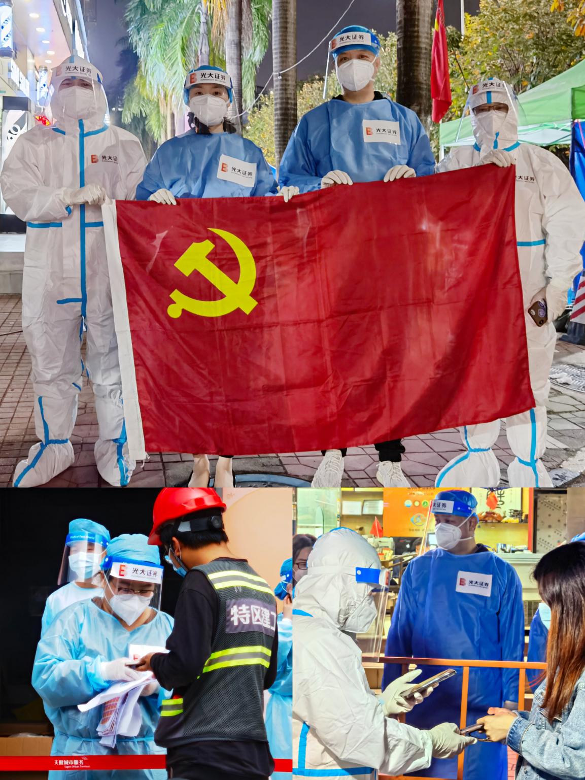 光大證券深圳分公司發(fā)揮基層黨組織戰(zhàn)斗堡壘作用和黨員先鋒模范作用,黨員干部迅速牽頭組建了“光證深分先鋒隊(duì)”,下沉基層抗疫一線,黨員同志們換上防護(hù)服、手套和隔離面罩深入蓮花街道多個社區(qū),全力協(xié)助醫(yī)護(hù)人員做好核酸檢測的輔助工作。從白天到黑夜的堅(jiān)守,頂著溫差很大的深夜寒風(fēng),保持良好狀態(tài),為廣大群眾的身體健康安全提供了有力保障。一句句暖心的提示、一個個忙碌的身影,光大證券深圳分公司的志愿者們,用實(shí)際行動,堅(jiān)定地守護(hù)著鵬城的人們!