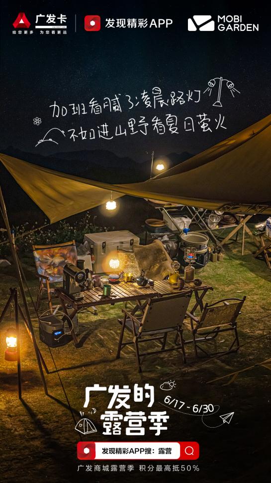 讀特客戶端?深圳新聞網(wǎng)2022年7月6日訊(記者 朱琳)一頂帳篷、一片草地、一桌餐品,呼吸戶外新鮮空氣放松身心……露營(yíng)逐漸成為年輕人的戶外休閑方式。對(duì)此,廣發(fā)信用卡繼推出國(guó)內(nèi)首個(gè)沉浸式夜宿露營(yíng)發(fā)布會(huì)之后,近日又以露營(yíng)主題切入新世代年輕人的需求點(diǎn),布局戶外露營(yíng)場(chǎng)景,上線為期兩月的“廣發(fā)的露營(yíng)季”主題活動(dòng),在提倡城市生活“慢下來,去感受”理念的同時(shí),也釋放了一大波戶外露營(yíng)標(biāo)配商品的折扣福利干貨。