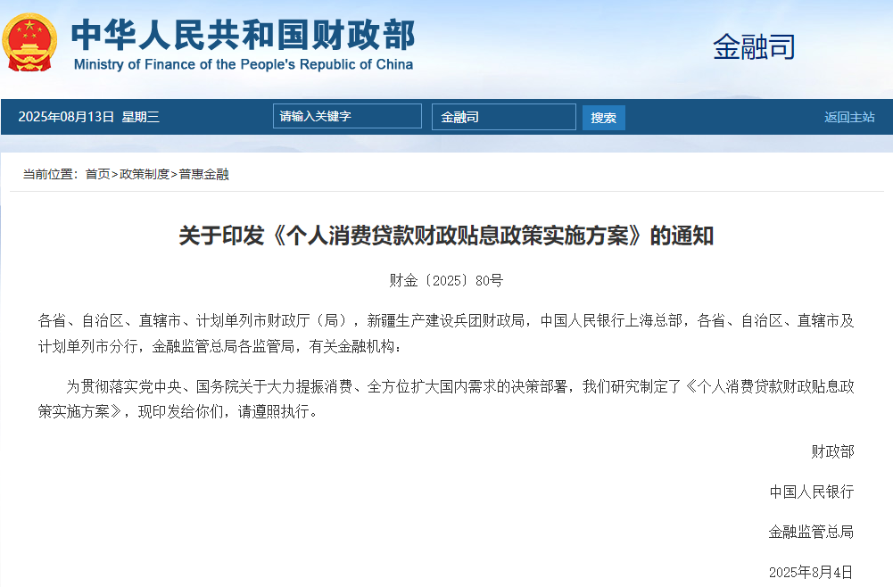 深圳新聞網(wǎng)2025年8月13日訊(記者 湯莎)近日,財政部、中國人民銀行、金融監(jiān)管總局印發(fā)《個人消費(fèi)貸款財政貼息政策實施方案》(以下簡稱方案),中央及省級財政將對符合條件的個人消費(fèi)貸款實施貼息。