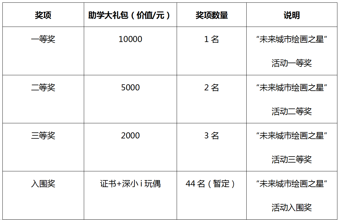 (2)入圍決賽的44名參賽選手將獲得入圍獎(參賽證書、深小i玩偶)。