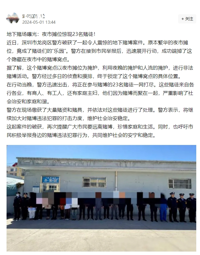 有網(wǎng)民在某社交平臺(tái)發(fā)帖稱:“近日,深圳市龍崗區(qū)破獲了一起令人震驚的地下賭博案件。原本繁華的夜市攤位,竟成了賭徒們的‘樂(lè)園’?!饼垗弲^(qū)相關(guān)部門第一時(shí)間對(duì)該內(nèi)容進(jìn)行核查,確認(rèn)此消息不實(shí),龍崗區(qū)沒(méi)有發(fā)生此類案件。