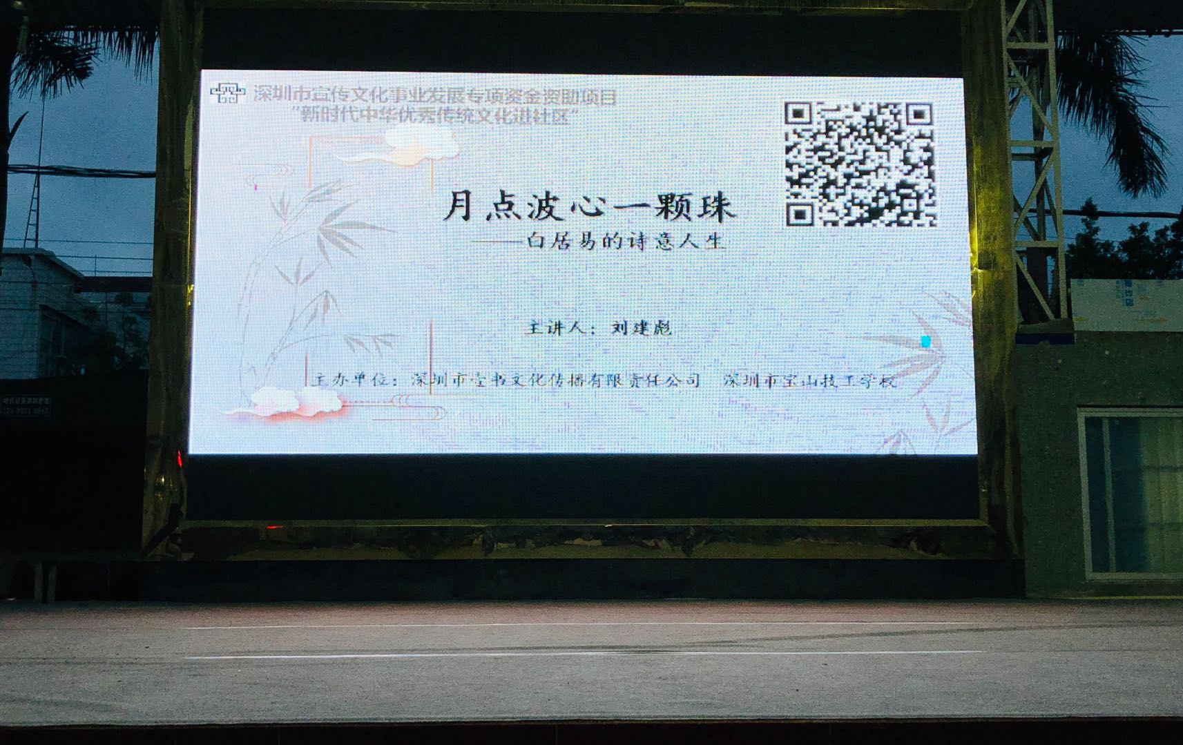 深圳新聞網(wǎng)訊 5月29日晚上,“新時(shí)代中華優(yōu)秀傳統(tǒng)文化進(jìn)社區(qū)”系列活動(dòng)第三場(chǎng)公益文化講座之“月點(diǎn)波心一顆珠——白居易的詩(shī)意人生”在深圳市寶山技工學(xué)校寶山大舞臺(tái)拉開帷幕,由愛詩(shī)家創(chuàng)始人劉建彪帶領(lǐng)聽眾一同走進(jìn)“詩(shī)王”的詩(shī)意世界,感悟其至情至性。