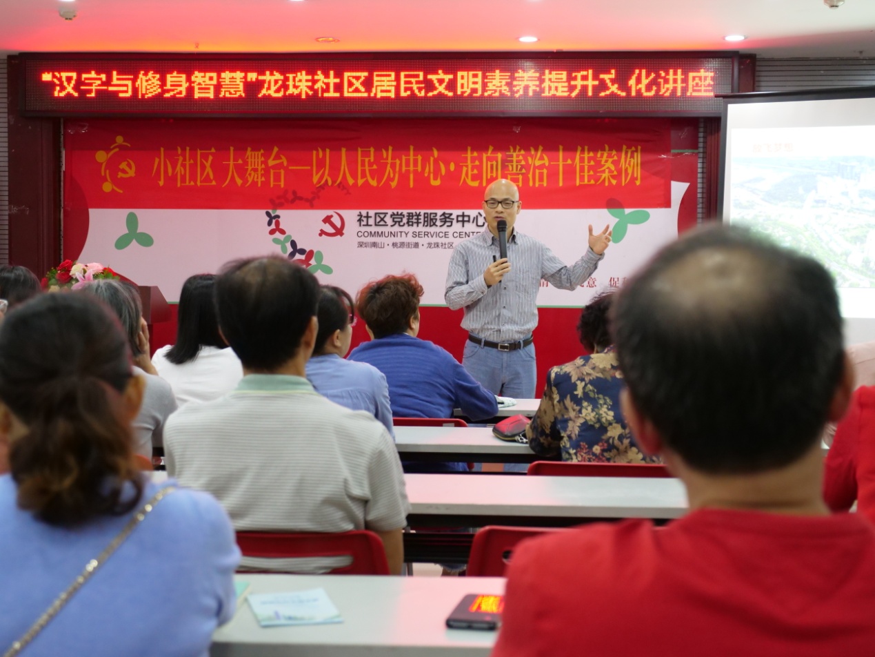 深圳新聞網(wǎng)訊 為更好地創(chuàng)建第六屆全國文明城市,以創(chuàng)新的活動(dòng)形式提升社區(qū)居民的文明素養(yǎng),11月15日上午,龍珠社區(qū)舉行了“‘漢字與修身智慧’社區(qū)居民文明素養(yǎng)提升”專題文化講座,邀請壹讀書會(huì)創(chuàng)始人、知名閱讀推廣人、《漢字與修身智慧》的作者劉建彪擔(dān)任主講嘉賓,從中華文明的基因(漢字)出發(fā),解讀深圳市民公約,旨在啟發(fā)居民在中華優(yōu)秀傳統(tǒng)文化的感召之下,踐行文明禮儀,用實(shí)際行動(dòng)去推進(jìn)文明城市的創(chuàng)建。