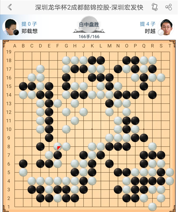 一臺(tái)快棋時(shí)越執(zhí)白對(duì)陣鄭載想。開局黑棋打入左邊白棋模樣,之后黑棋棋形處理不佳,被白棋一路猛攻后損失慘重。之后白棋沒(méi)有再給黑棋機(jī)會(huì)活動(dòng)勝利。