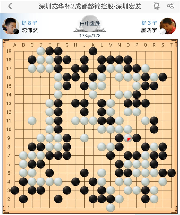 第四臺(tái)小將沈沛然執(zhí)黑對(duì)陣屠曉宇,行至178手時(shí),盤面形勢(shì)白微弱領(lǐng)先。大家認(rèn)為若努力收官或許有一線希望時(shí),沈沛然停鐘認(rèn)輸,也許是看清了形勢(shì)的無(wú)奈之舉吧。