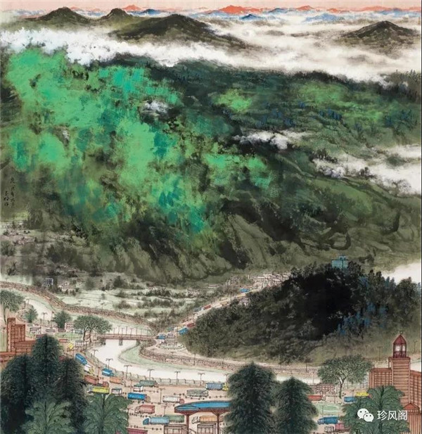 來自南京而定居于深圳的宋玉明,試圖將新金陵畫派表現(xiàn)現(xiàn)實的變革精神用于現(xiàn)代城市山水畫的探索上。作為新金陵畫派的第二代畫家,宋玉明直接承傳了宋文治表現(xiàn)現(xiàn)代太湖人居環(huán)境秀潤而精巧的家法,并將此種大山景加小民居的畫法轉(zhuǎn)用到深圳城市形態(tài)的表現(xiàn)上。這里,我們一方面可以看到深圳作為一個新興的現(xiàn)代城市借山而筑、注重自然環(huán)境在城市生態(tài)建設(shè)上的積極作用;另一方面,深圳這種與自然相統(tǒng)一的現(xiàn)代化城市建設(shè)理念,也為宋玉明進行城市山水畫創(chuàng)作提供了完美的表現(xiàn)對象。在《深圳文錦渡》等作品里,我們看到了畫家巧妙地將城市現(xiàn)代建筑與自然山水融為一體的表現(xiàn)。這些畫作,大多以勾線渲染的方法表現(xiàn)遠景中的商用或市政建筑設(shè)施,也因這些建筑被設(shè)置在中遠景,不僅減少了建筑塑造的困窘,而且突出了這些人居建筑與自然相得益彰的和諧關(guān)系。這些畫作,從嚴(yán)格的意義上說,仍然是山水畫,而宋式小散鋒皴以及云煙雨霧的渲染,也為畫面增添了幽深、恬靜、高雅、平和的意趣與境界。這些畫作,讓我們所熟悉的城市從一個相對遙遠的視角來觀看,既因距離產(chǎn)生了一種從未體驗過的美感,也較好地體現(xiàn)了現(xiàn)代城市與自然占位的協(xié)調(diào)統(tǒng)一、舒適宜居的比例關(guān)系。