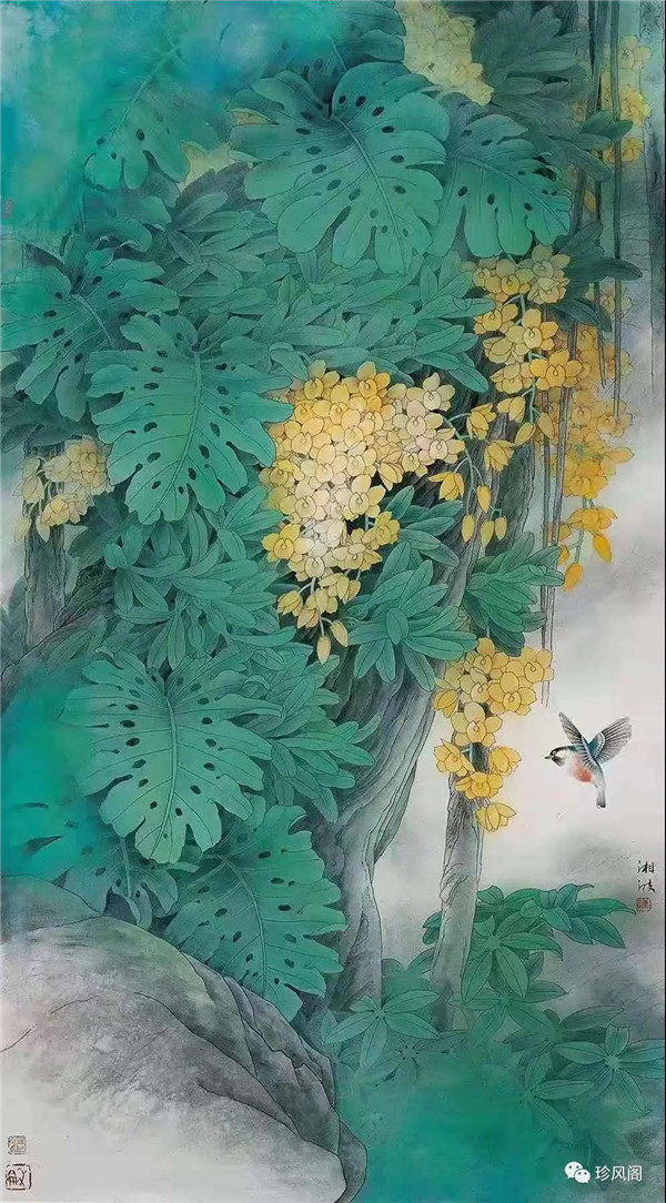 總的來看,陳湘波先生的工筆花鳥畫,繼承了嶺南畫派重生活、重色彩、重創(chuàng)造的優(yōu)秀傳統(tǒng),創(chuàng)作出來的是一系列意境深邃幽遠的作品。他在繼承傳統(tǒng)的基礎(chǔ)上,借鑒現(xiàn)代設(shè)計、西方繪畫的元素以及其他畫種的繪畫技法,形成了符合現(xiàn)代人審美的具有個人風(fēng)格的當(dāng)代工筆花鳥作品。