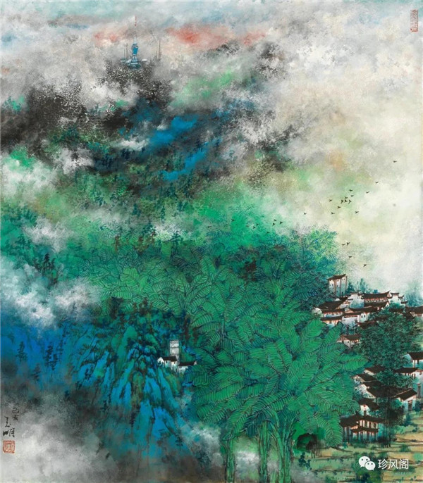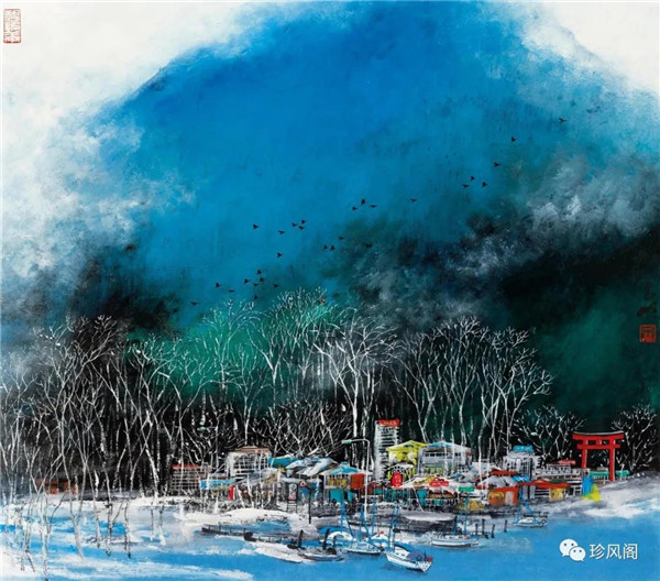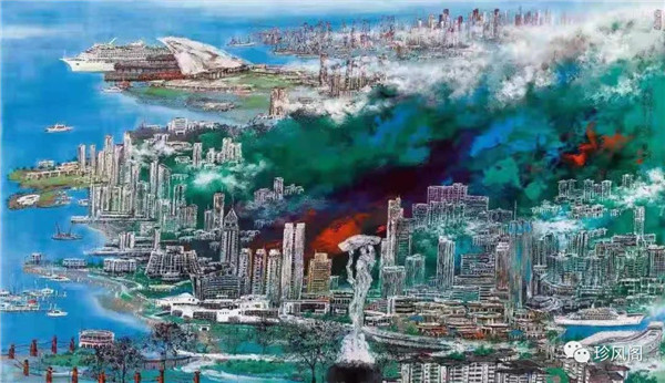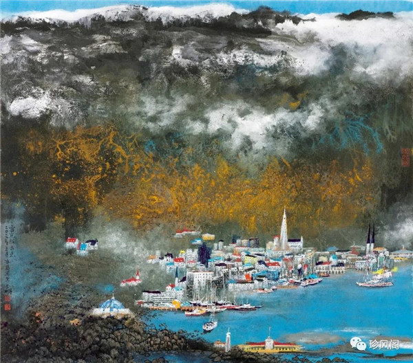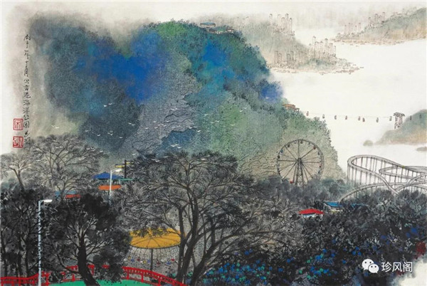 宋玉明從金陵畫派的新傳統(tǒng)跨越到城市表現(xiàn)的積彩拓墨畫法,既體現(xiàn)了現(xiàn)代化城市對于變革傳統(tǒng)的時代訴求,也體現(xiàn)了他移居深圳后這座新興城市文化對于他的深刻影響。畢竟,連續(xù)數(shù)屆的深圳水墨雙年展對于水墨在跨文化中重要作用與表現(xiàn)方法的突破,都給予他至深的思想開拓。這表明,城市山水畫已不單純是用中國畫表現(xiàn)城市的命題,而是其中能夠蘊含多少城市文化觀念與城市審美的方法,宋玉明對于城市山水畫的探索,體現(xiàn)的正是這樣一種對城市現(xiàn)代文化的思想融合性。而不拘謹(jǐn)于城市一磚一石、一街一道、一房一樓的描繪,著眼于發(fā)揮水墨與彩墨表現(xiàn)的自由性,抑或體現(xiàn)了人性、自然與現(xiàn)代城市共同作用的現(xiàn)代生活方式與人文理想。的確,純粹用中國畫或水墨畫來探索城市的現(xiàn)代化景觀表現(xiàn),也許只是淺層次的審美需求;而只有當(dāng)把山水畫作為人與自然和諧統(tǒng)一的觀念表達植入城市現(xiàn)代化的審美訴求時,城市山水畫才能真正凸顯出其深刻的美學(xué)價值。這正是我們從宋玉明的作品里能夠讀解到的他對于城市山水畫審美理想的一種勾畫。