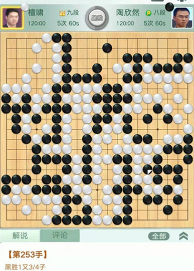 陶欣然執(zhí)黑對(duì)陣檀嘯。中盤白棋在右邊下出緩手,導(dǎo)致攻守逆轉(zhuǎn),白棋被迫做劫求活。黑棋利用劫爭中央連走兩手獲利巨大。之后黑棋穩(wěn)健收官將優(yōu)勢(shì)保持至終局。