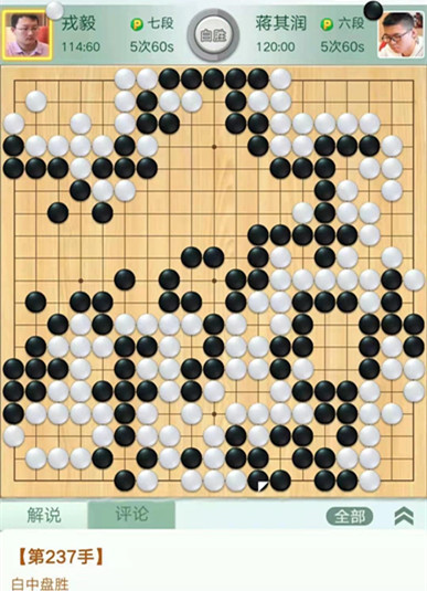 戎毅執(zhí)白對(duì)陣蔣其潤。開局白取地中央黑模樣巨大,白淺消后黑棋攻擊不當(dāng),被白活出兩塊棋后白棋領(lǐng)先。之后黑棋左下棄子圍空又虧損,白棋以較大優(yōu)勢(shì)獲得勝利。