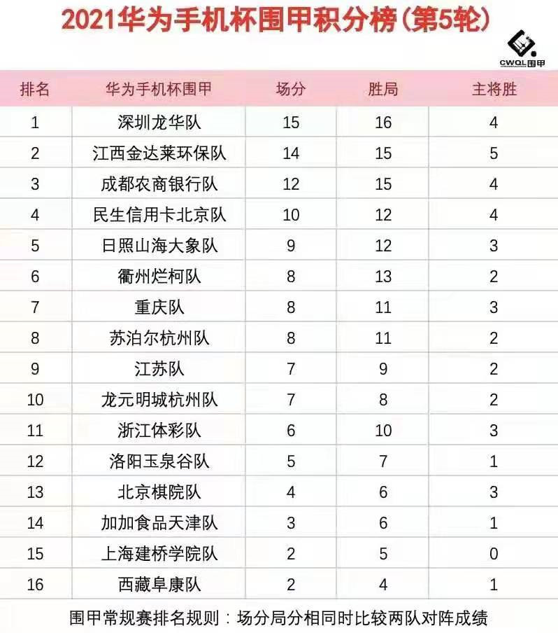 第五輪各隊(duì)?wèi)?zhàn)況如下:衢州爛柯4比0勝加加食品天津;浙江體彩隊(duì)1:3深圳龍華隊(duì);日照山海大象隊(duì)1:3江西金達(dá)萊環(huán)保隊(duì);重慶隊(duì)3比1民生信用卡北京隊(duì);成都農(nóng)商銀行隊(duì)3:1勝江蘇隊(duì);西藏阜康2:2主將勝上海建橋?qū)W院;北京棋院隊(duì)2:2主將勝洛陽玉泉谷隊(duì);蘇泊爾杭州2:2主將負(fù)龍?jiān)鞒呛贾荨5谝浑A段結(jié)束,深圳龍華隊(duì)五戰(zhàn)全勝積15分居“魁首”,江西金達(dá)萊環(huán)保隊(duì)僅以一分之差緊隨其后,成都農(nóng)商銀行隊(duì)積12分居第三位。