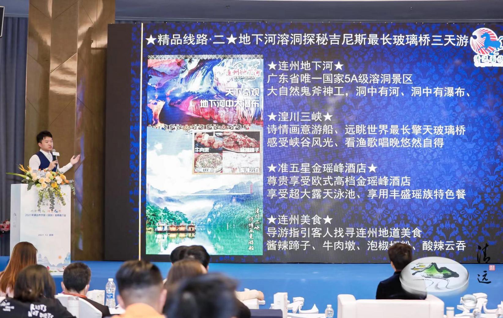 文化是旅游的靈魂,旅游是文化的載體。近年來(lái),清遠(yuǎn)依托自然資源稟賦和深厚的文化底蘊(yùn),多措并舉推動(dòng)文旅融合發(fā)展,文旅產(chǎn)業(yè)呈現(xiàn)欣欣向榮局面。現(xiàn)場(chǎng),清遠(yuǎn)市珠水美悅酒店管理有限公司總經(jīng)理宋玉亮、清遠(yuǎn)市古龍峽生態(tài)旅游娛樂(lè)有限公司營(yíng)銷(xiāo)專(zhuān)員林嘉儀、清遠(yuǎn)市愛(ài)地旅游發(fā)展有限公司營(yíng)銷(xiāo)經(jīng)理?xiàng)钍婧?、清遠(yuǎn)市國(guó)業(yè)旅游開(kāi)發(fā)有限公司常務(wù)副總經(jīng)理韓勇,依次以圖文并茂、聲畫(huà)結(jié)合的形式,推介了美林湖景區(qū),古龍峽景區(qū),連州地下河、湟川三峽、龍?zhí)犊蜅!⑶嫣觳A?、連州大酒店,峰林曉鎮(zhèn)、洞天仙境,讓與會(huì)人員身臨其境感受山水清遠(yuǎn)的魅力;清遠(yuǎn)市國(guó)旅國(guó)際旅行社有限責(zé)任公司業(yè)務(wù)總監(jiān)李國(guó)華則現(xiàn)場(chǎng)推介了古龍峽云天玻霸?xún)商煊?、地下河溶洞探秘及吉尼斯最長(zhǎng)玻璃橋三天游等5條精品旅游線(xiàn)路,現(xiàn)場(chǎng)“種草”清遠(yuǎn)眾多網(wǎng)紅打卡點(diǎn)。