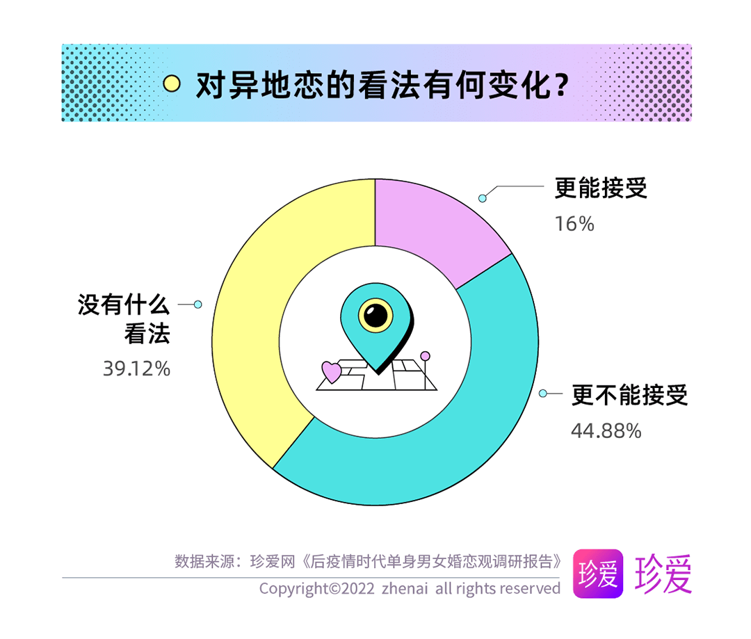 疫情期間的所見所聞使得單身青年們對戀愛模式有了不同的看法,調查發(fā)現(xiàn),近五成(44.88%)的人表示更不能接受異地戀了;僅16%的人表示更能接受。女性(50.8%)比男性(30.64%)更不能接受異地戀。