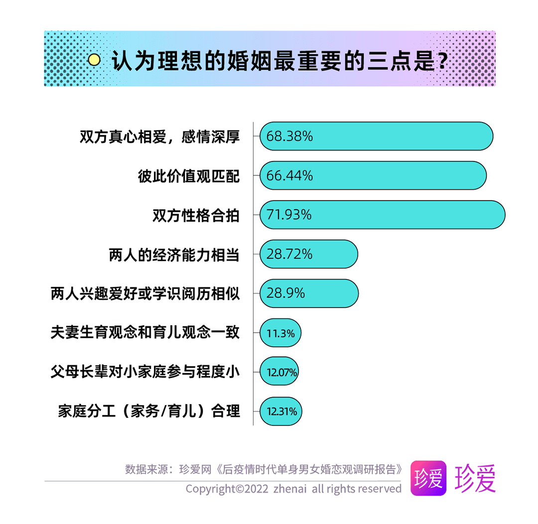 經(jīng)歷過疫情后,居家期間的家庭生活或他人的故事也令單身青年們對婚姻有了新的理解,調查顯示,理想的婚姻最重要的因素為彼此性格合拍(71.93%),高于雙方真心相愛(68.38%)和兩人的價值觀匹配(66.44%)。