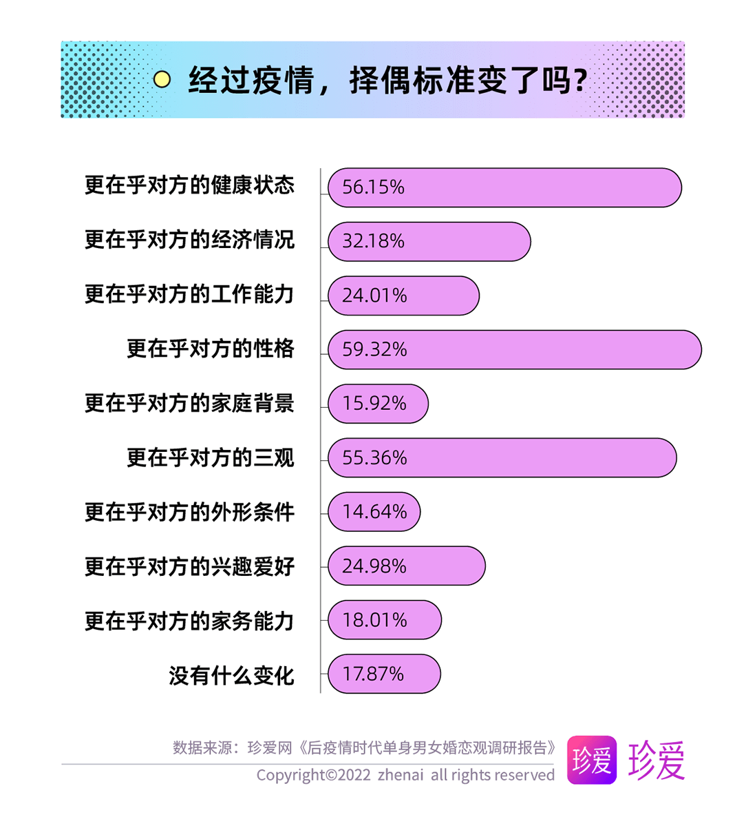 人們的生活方式和心態(tài)因疫情影響有或多或少的改變,而單身青年們的擇偶標準也在發(fā)生著變化,調查顯示,經(jīng)歷過疫情,單身青年們更在乎的擇偶條件包括對方的性格(59.32%)、健康狀態(tài)(56.15%)和三觀(55.36%),對方的經(jīng)濟情況、興趣愛好、工作能力以及家務能力也是考量的重要標準。