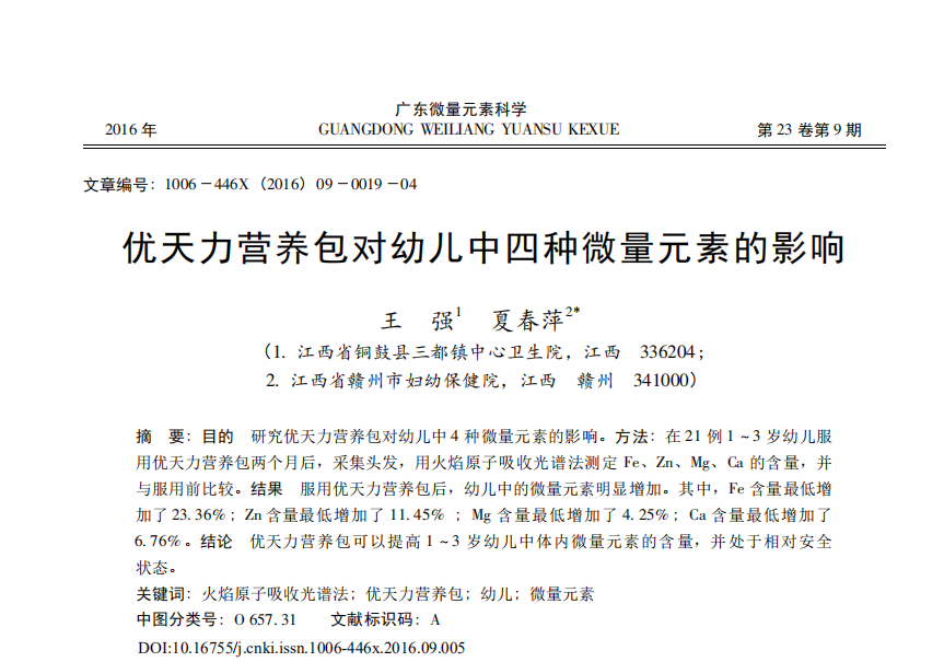 王強(qiáng),夏春萍.優(yōu)天力營養(yǎng)包對幼兒中四種微量元素的影響[J].廣東微量元素科學(xué),2016