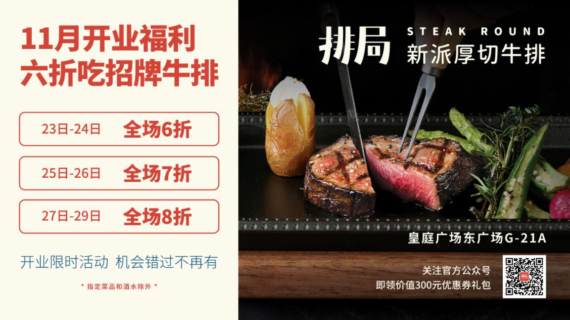 排局·新派厚切牛排為了慶賀開業(yè),也為消費者們帶來了勁爆的開業(yè)福利——11月23日至24日兩天全場6折,11月25日至26日兩天全場7折,11月27日至29日三天全場8折。另外搜索“排局”關(guān)注官方公眾號,即可免費領(lǐng)取價值300元優(yōu)惠券禮包。