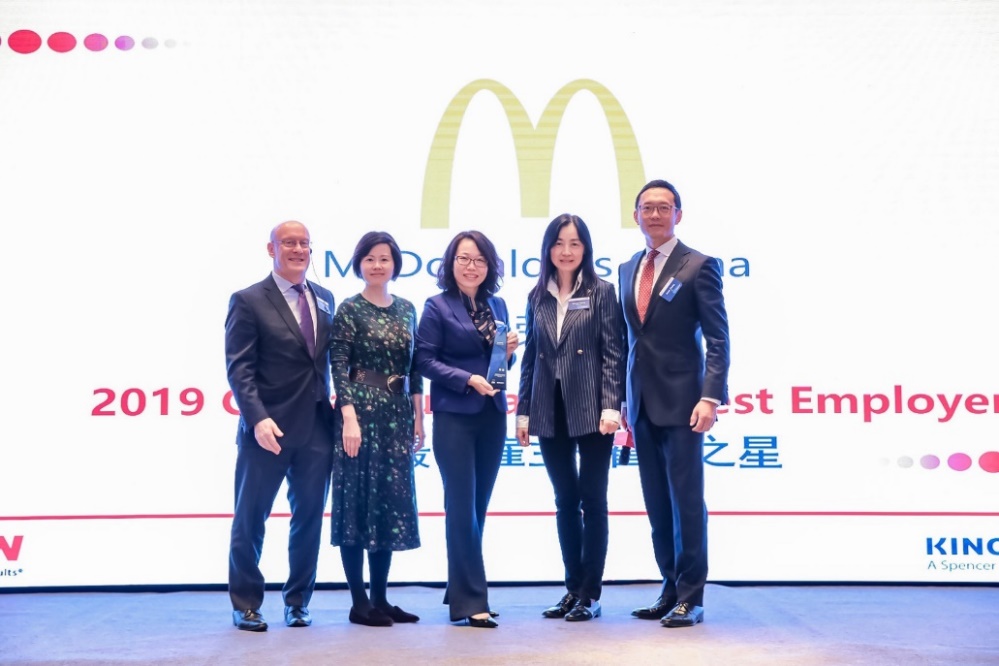 麥當(dāng)勞中國首席人員官王艷偉(中 )代表公司接受2019“怡安中國最佳雇主”稱號(hào)