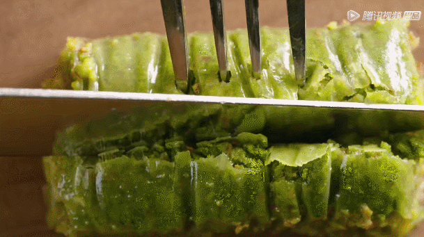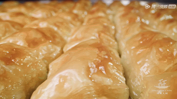 奶酪加滿滿的開心果碎,上下覆蓋二十層薄如蟬翼的面皮,小伙子苦苦練習(xí)七年搟面皮,十幾張面皮同時(shí)搟壓,每張的厚度不超過0.1毫米,